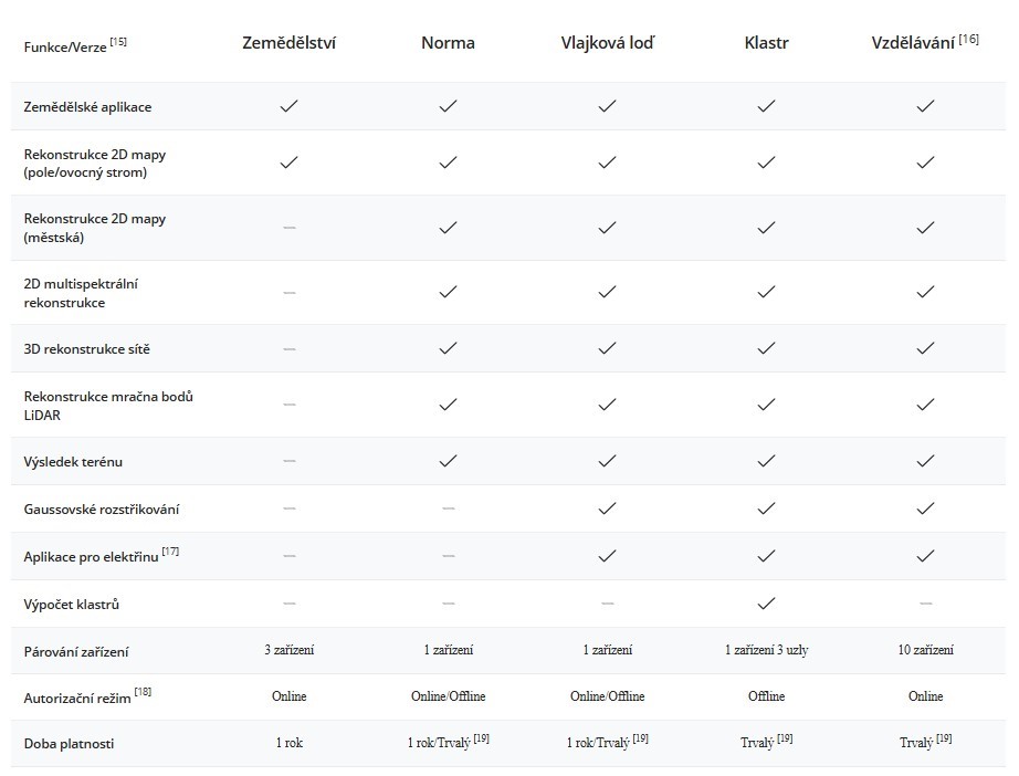 12. Schopnost zpracovat 6000 snímků na 1 GB dostupné paměti RAM je založena na výsledcích testů s využitím leteckých fotografických dat s 80% překrytím vpřed, 70% překrytím v boku, snímáním shora dolů a informacemi GPS. Výsledky se mohou lišit v závislosti na tom, jak moc se snímky překrývají a jak složitá je scéna.
